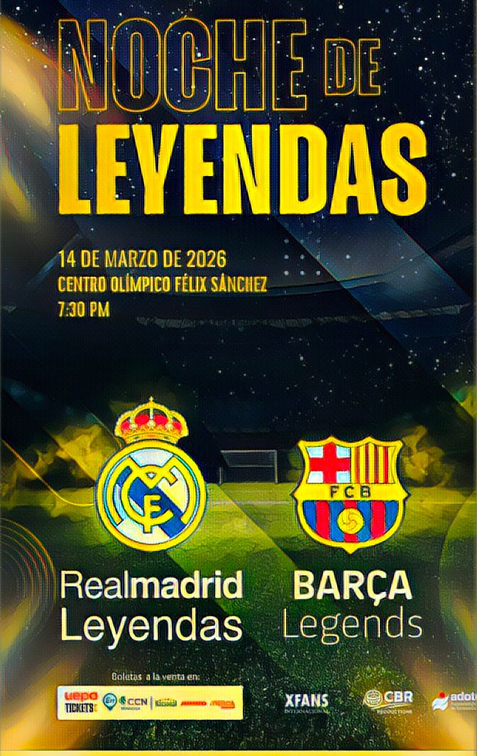 Con el respaldo de la Asociación Dominicana de Turismo Deportivo (ADOTURD), CBR Productions anunció oficialmente la nueva fecha del tan esperado partido “Noche de Leyendas”, que enfrentará a las glorias del Real Madrid Legends y FC Barcelona Legends. El encuentro, uno de los eventos deportivos-espectáculo más anticipados del país, se celebrará el sábado 14 de marzo de 2026 a las 7:30 p.m. en el Estadio Olímpico Félix Sánchez.